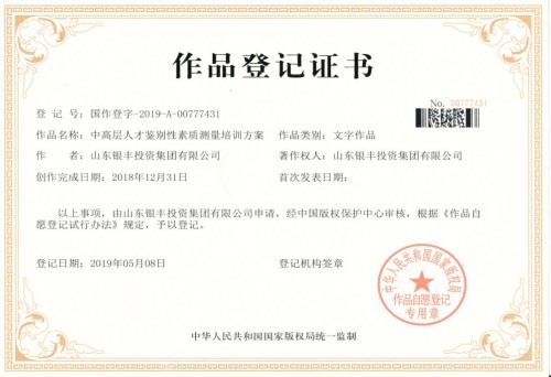 近期,经中国国家版权局认证,由银丰控股集团人力资源部自主研发的培训体系方案《中高层人才鉴别性素质测量培训方案®》顺利取得作品注册版权。银丰集团成为山东省内首家将研发的管理方案纳入国家版权局认证体系的企业。